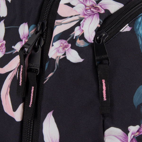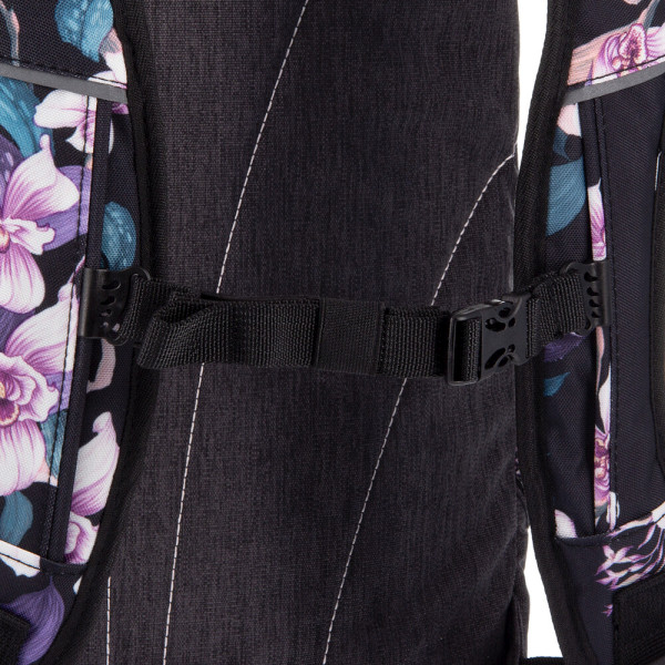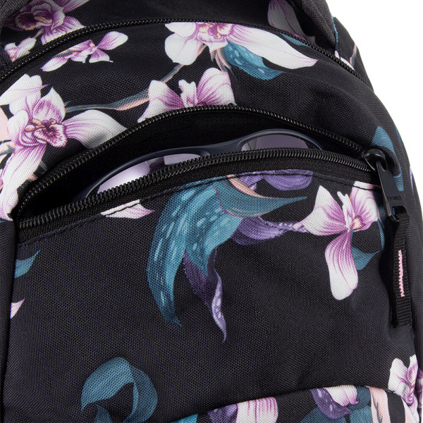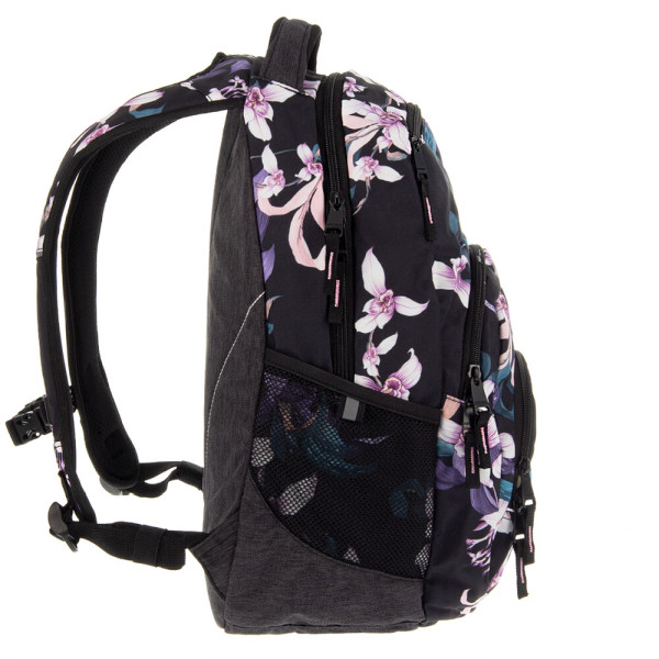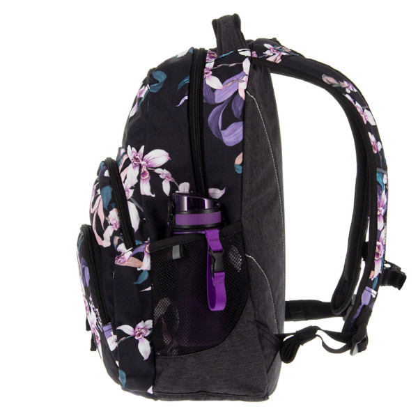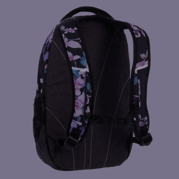 A fekete hátizsákot lilás színvilágú orchideák díszítik. A minta a kamaszlányok ízléséhez lett igazítva. A nagy méretű erős anyagú táska alkalmas kamaszoknak iskolatáskának, illetve kirándulós hátizsáknak.