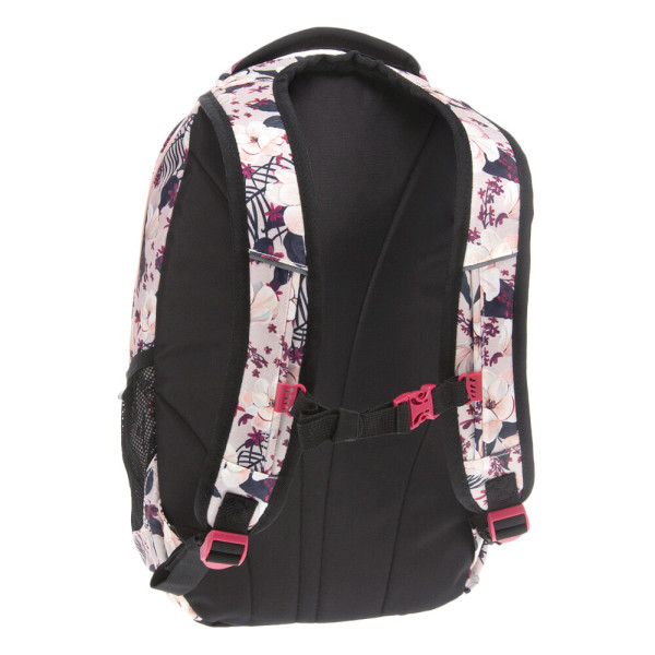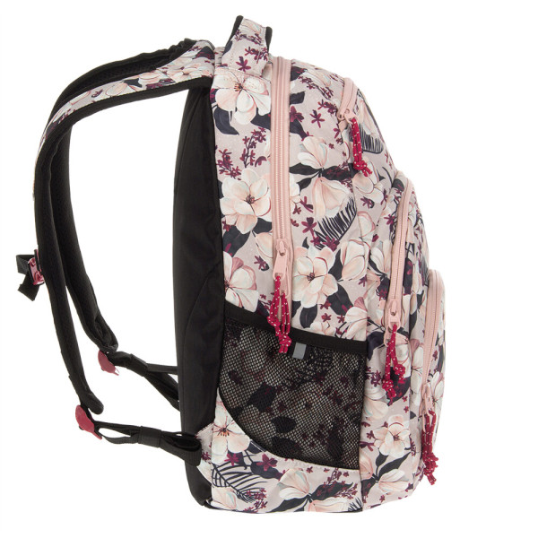 A rózsaszín színvilágú iskolatáska felsősöknek virágokkal van díszítve. A nagy méretű erős anyagú táska alkalmas tinédzsereknek iskolatáskának, illetve kirándulós hátizsáknak.