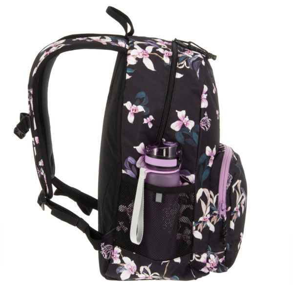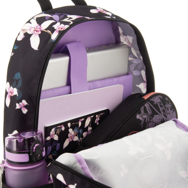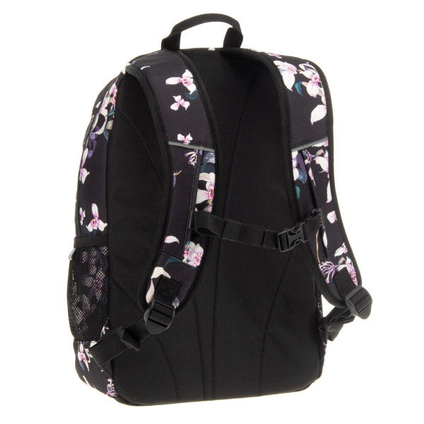 A felsősöknek készült fekete iskolatáskát lila orchidea virágok díszítik. A nagy méretű erős anyagú táska alkalmas tinédzsereknek iskolatáskának, illetve kirándulós hátizsáknak.