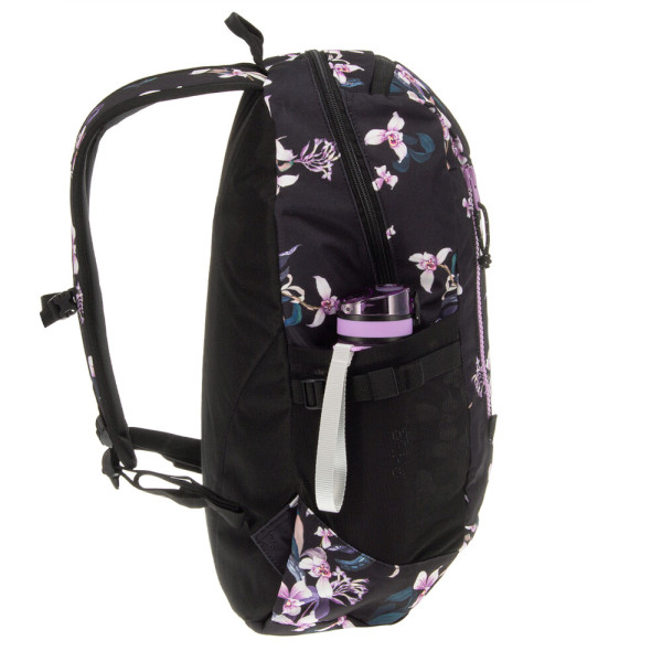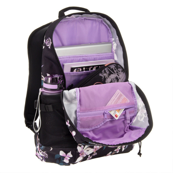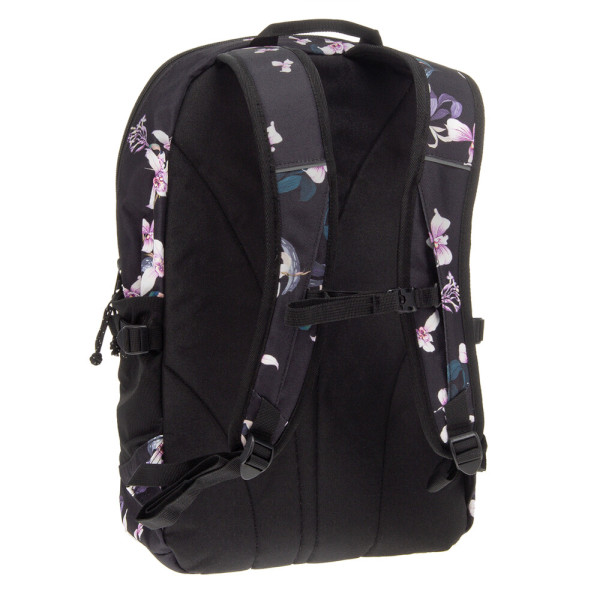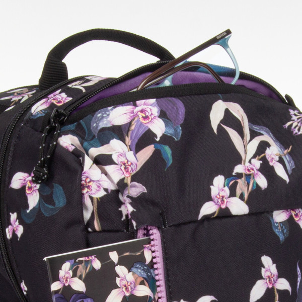A fekete urban típusú iskolatáska felsősöknek lila orchidea virágokkal van díszítve. A nagy méretű erős anyagú táska alkalmas tinédzsereknek iskolatáskának, illetve kirándulós hátizsáknak.